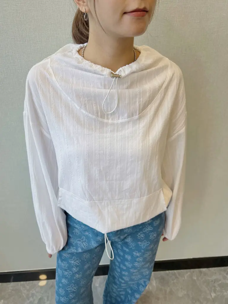 暗紋薄質地 / 抽繩高領、半圓線條 / 肚仔袋