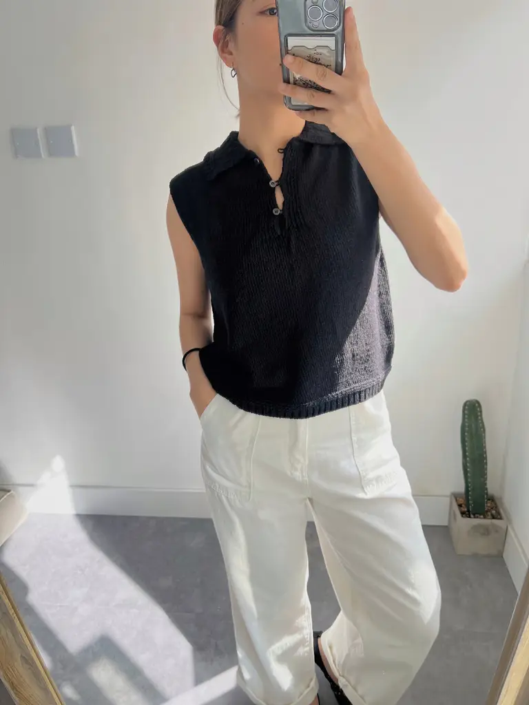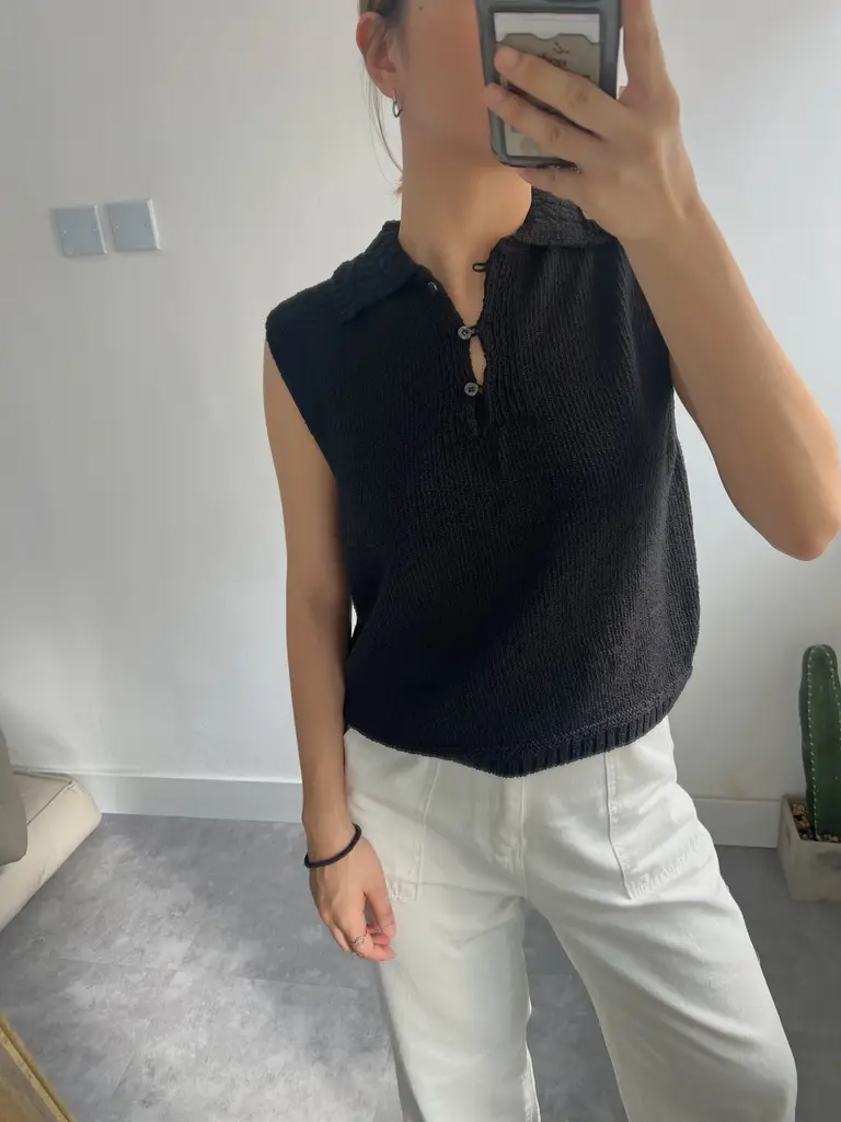 寬鬆Polo背心版形 // 領口鏤空織紋 // 半排扣設計