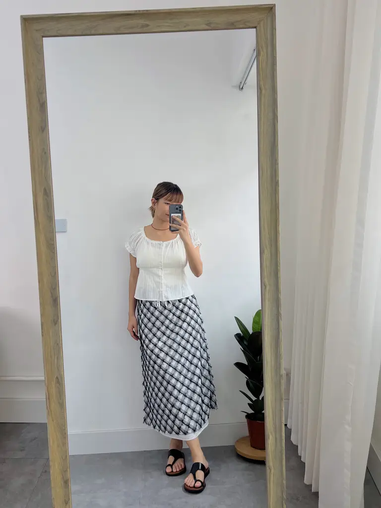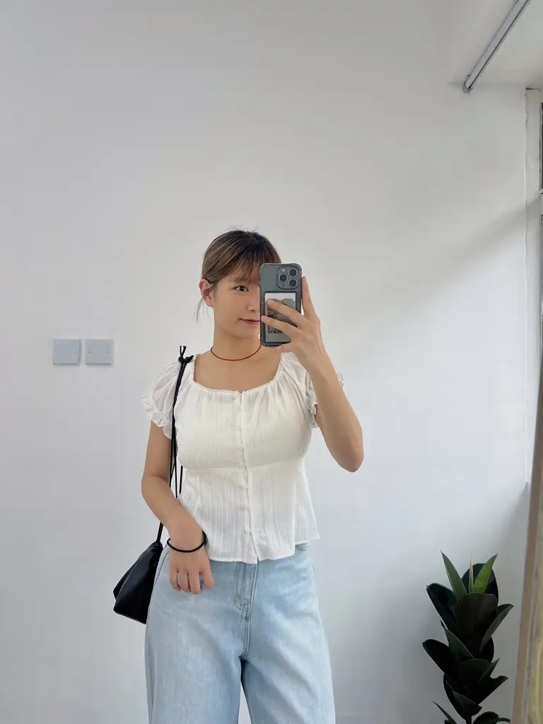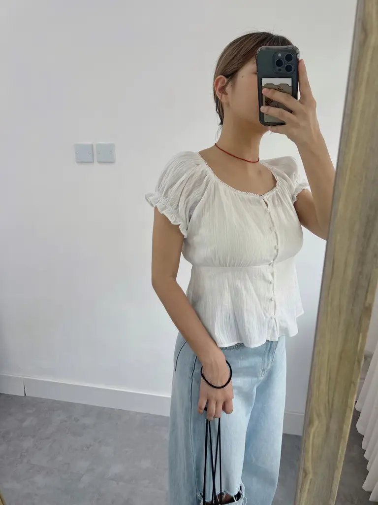 大圓領配lace 包邊 // 無特定肩線 // 微泡泡袖