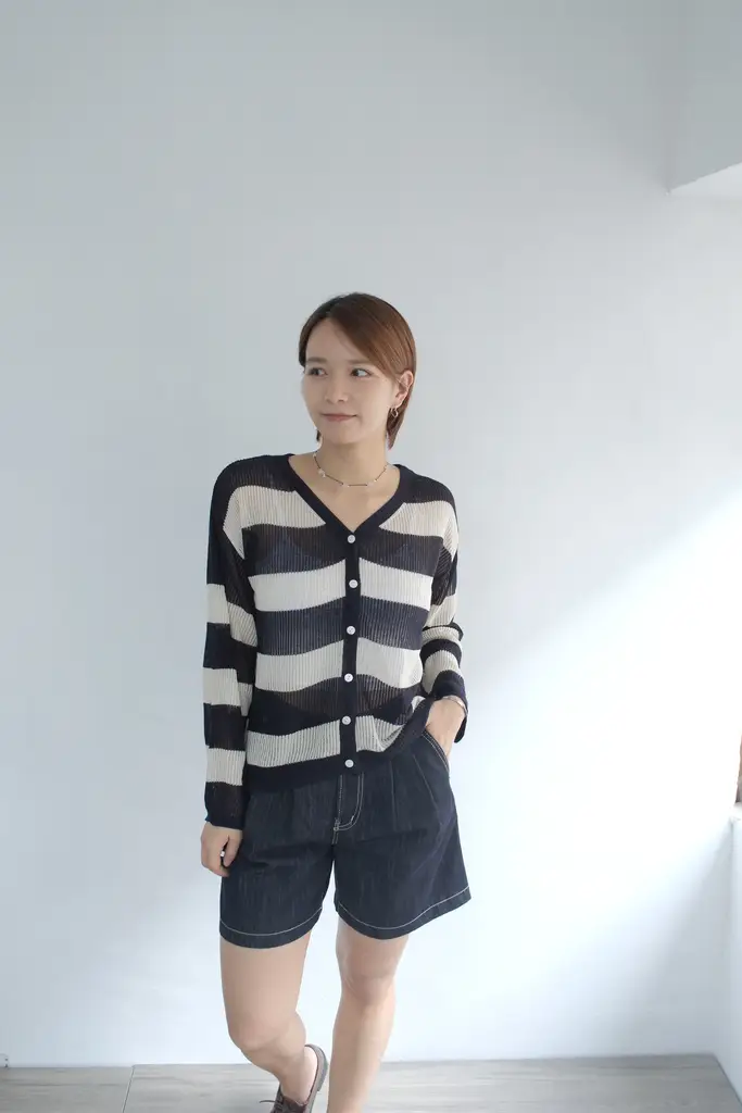 V領間條針織外套 (藍)